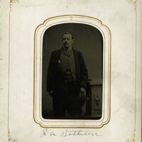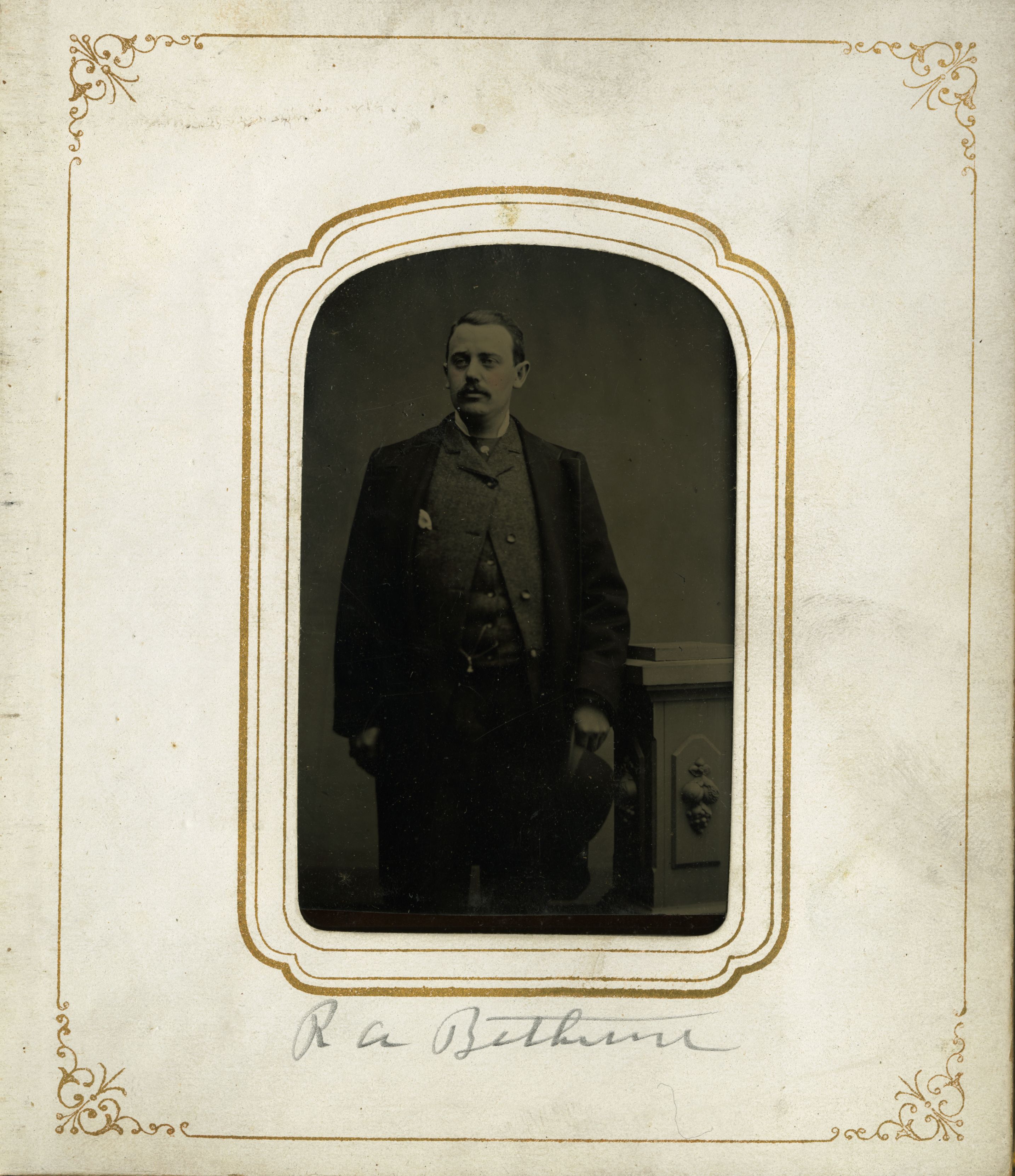 - Black and white photograph of Robert A. Bethune, standing. Page 9 of a tintype and cabinet card album, circa 1875.