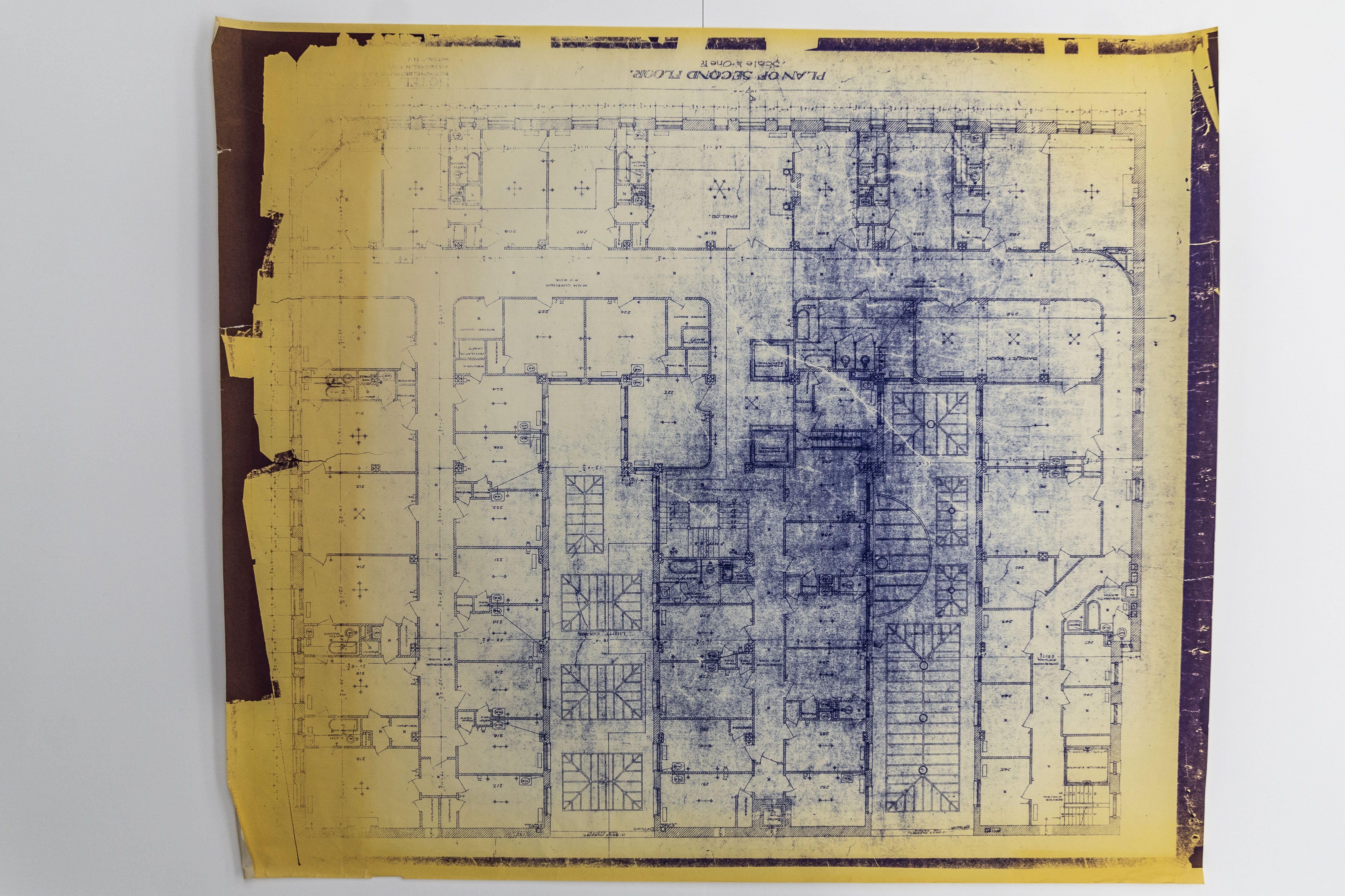 Diazotype architectural drawing created by Bethune, Bethune and Fuchs of the second floor of the Lafayette Hotel, 1901.