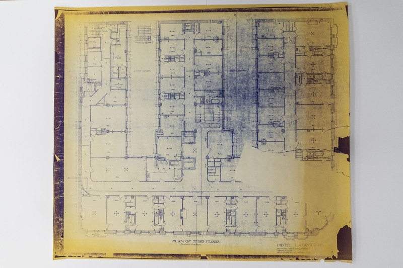 Diazotype architectural drawing created by Bethune, Bethune and Fuchs of the third floor of the Lafayette Hotel, 1901.