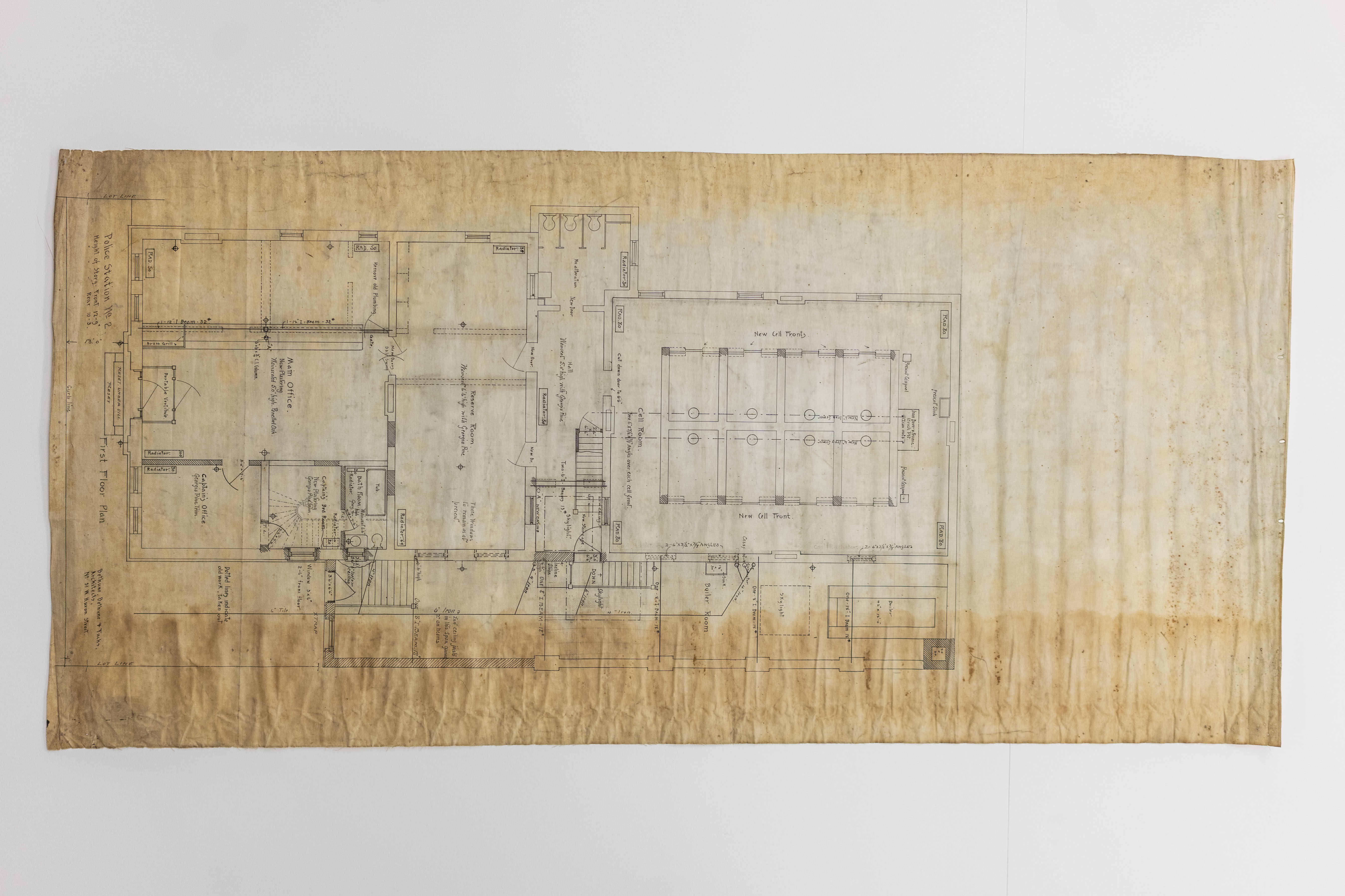 - Architectural drawing on linen by Bethune, Bethune and Fuchs of the first floor plan for Police Station No. 2 at 401 Seneca Street, circa 1887.