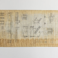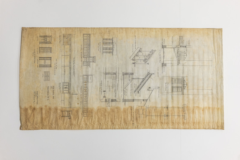 Scale Drawing Sheet on linen with detail of staircase, wainscoting and front of desk in main office, portable vestibule, and boiler room for Police Station No. 2 at 401 Seneca Street. Drawn by Bethune, Bethune and Fuchs, 1887.