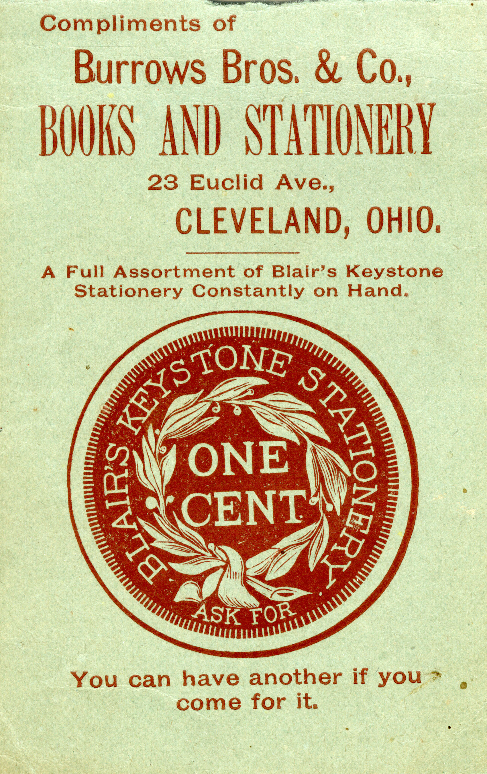 Compliments of Burrows Bros. & Co.,BOOKS AND STATIONERY23 Euclid Ave.,CLEVELAND, OHIO.A Full Assortment of Blair's Keystone Stationery Constantly on Hand.ASK FOR BLAIR'S KEYSTONE STATIONERY ONE CENTYou can have another if you come for it.