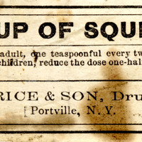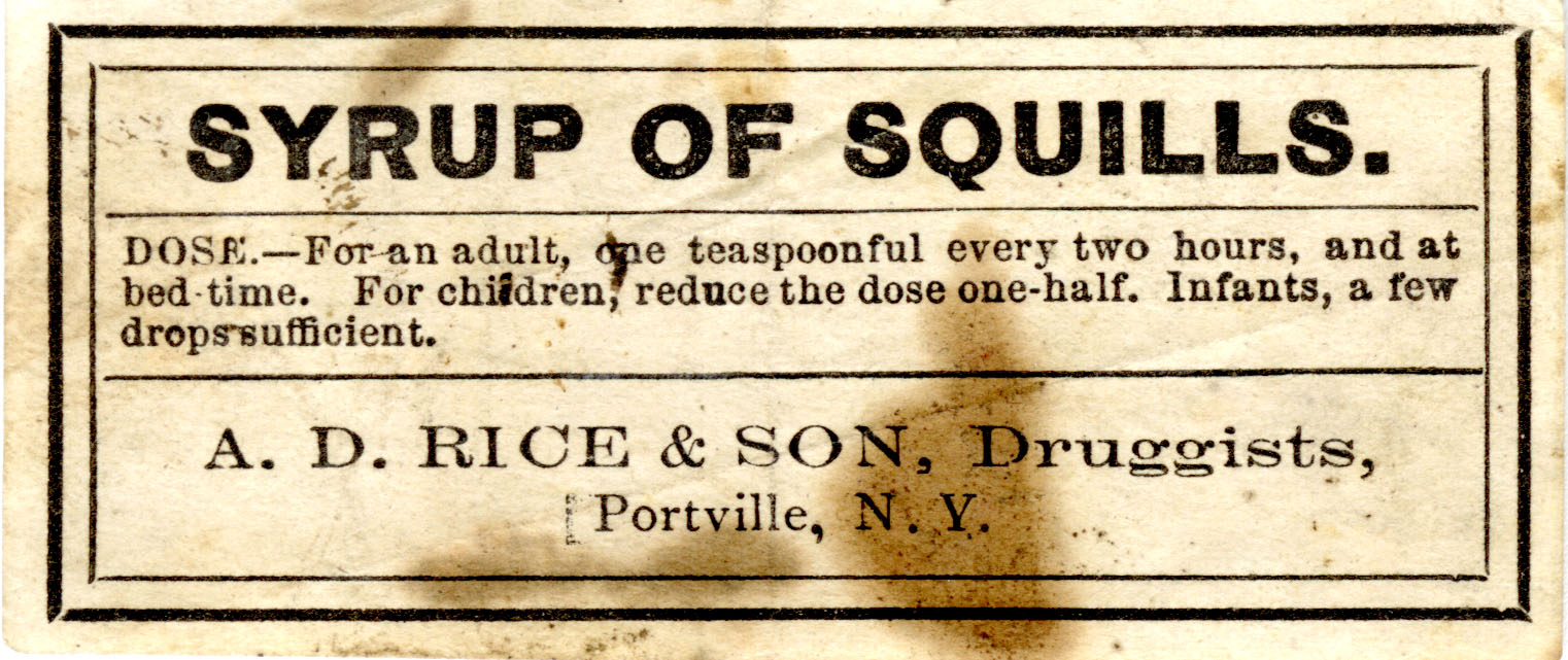 SYRUP OF SQUILLS.DOSE.—For an adult, one teaspoonful every two hours, and at bed time. For children, reduce the dose one-half. Infants, a few drops sufficient.A. D. RICE & SON, Druggists,Portville, N.Y.