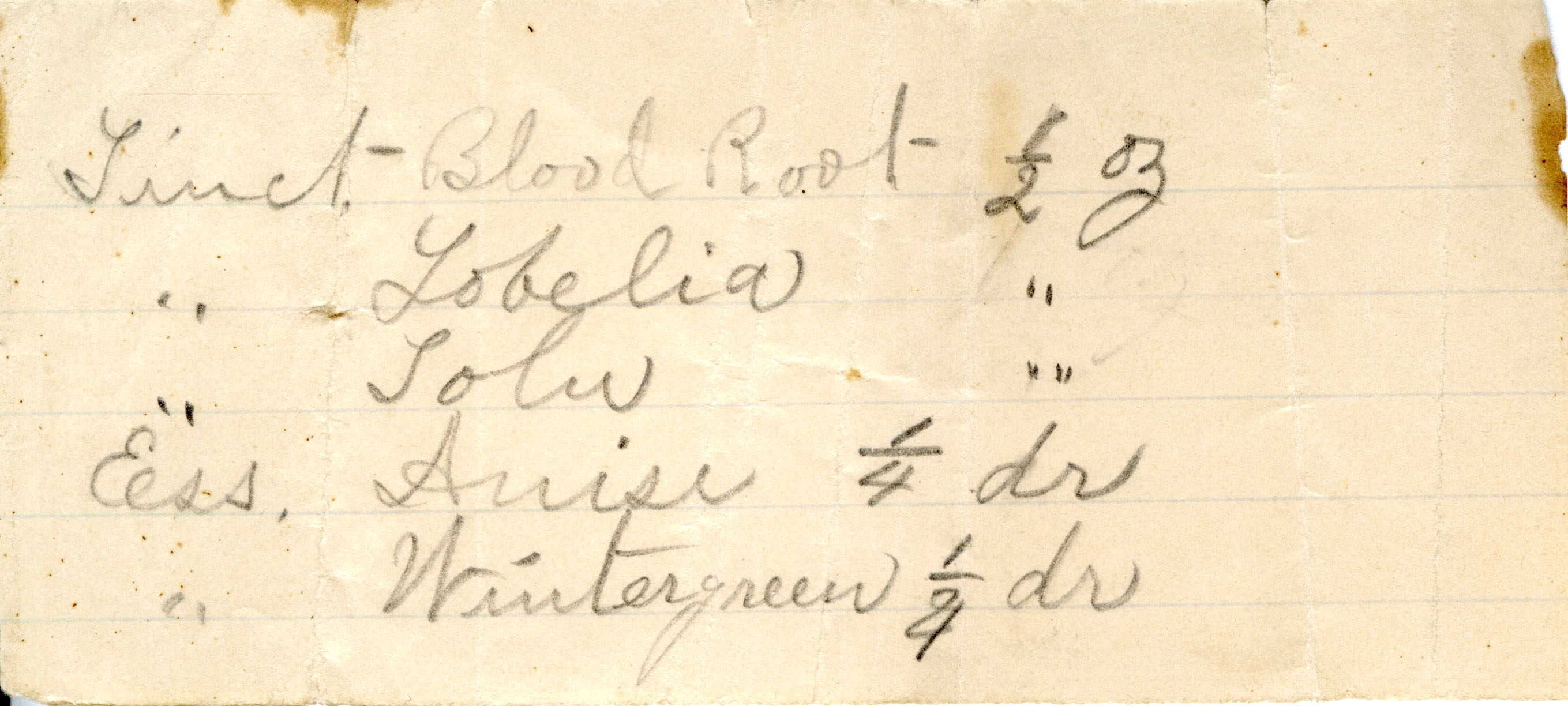 Tinct. - Blood Root - 1/2 oz" Lobelia "" Tolu ""Ess. Anise 1/4 dr" Wintergreen 1/4 dr