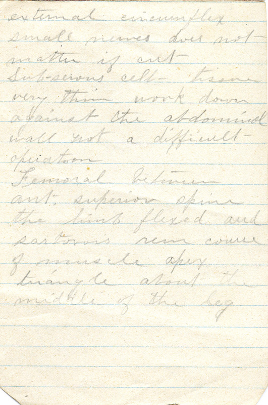 external circumflex small nerves does not matter if cut Sub-serous cell- tissue very thin work down against the abdominal wall not a difficult operation Femoral between ant. superior spine the limb flexed and sartorius rem course of muscle apex triangle about the middle of the leg Hernia a protrusion Inguinal Direct + indirect skin Direct super, fascia [external] [oth?giac] inter columnar cremaster musc, conj tendon trans. fascia Rings only when hernia has passed through before weak places covered by inter. col. fascia spreads between the two pillars of the ring Space between two rings inguinal canal and is usually closed when not is known