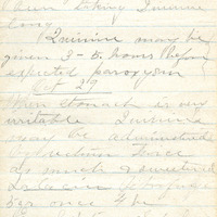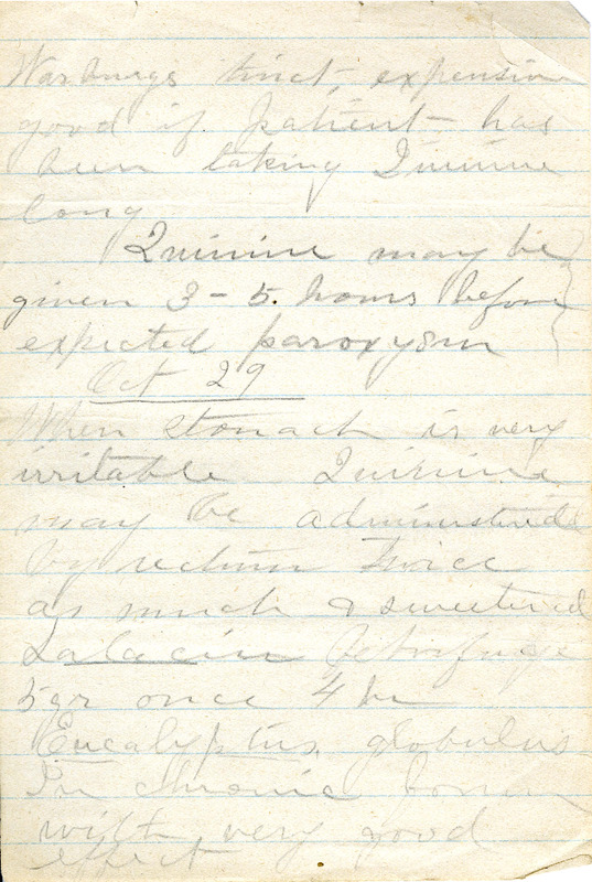 Warburgs tinct. expensive good if patient has been taking Quinine long Quinine may be given 3-5 hours before expected paroxysmOct 29 When stomach is very irritable Quinine may be administered by rectum twice as much + sweetened Lalacin febrifuge 5 gr once 4 hr Eucalyptus globulus In chronic form with very good Effect teaspoonful 3 oz 4 times a day, bleeding not [me.?] Opium just- or about 2 hrs before before you expect Paroxysm, Gave 2 gr. Dr. Hammond used nitric acid in all forms of malarions Diseases. 20 gH dilute Arsenic is famous may be given with Quinine 5-10 gHs Fowlers sol. common salt- teaspoonful dry 3-4 times a day Sulphatic [?] or 1/6 gr " Zinc [Cimarribra?] Se