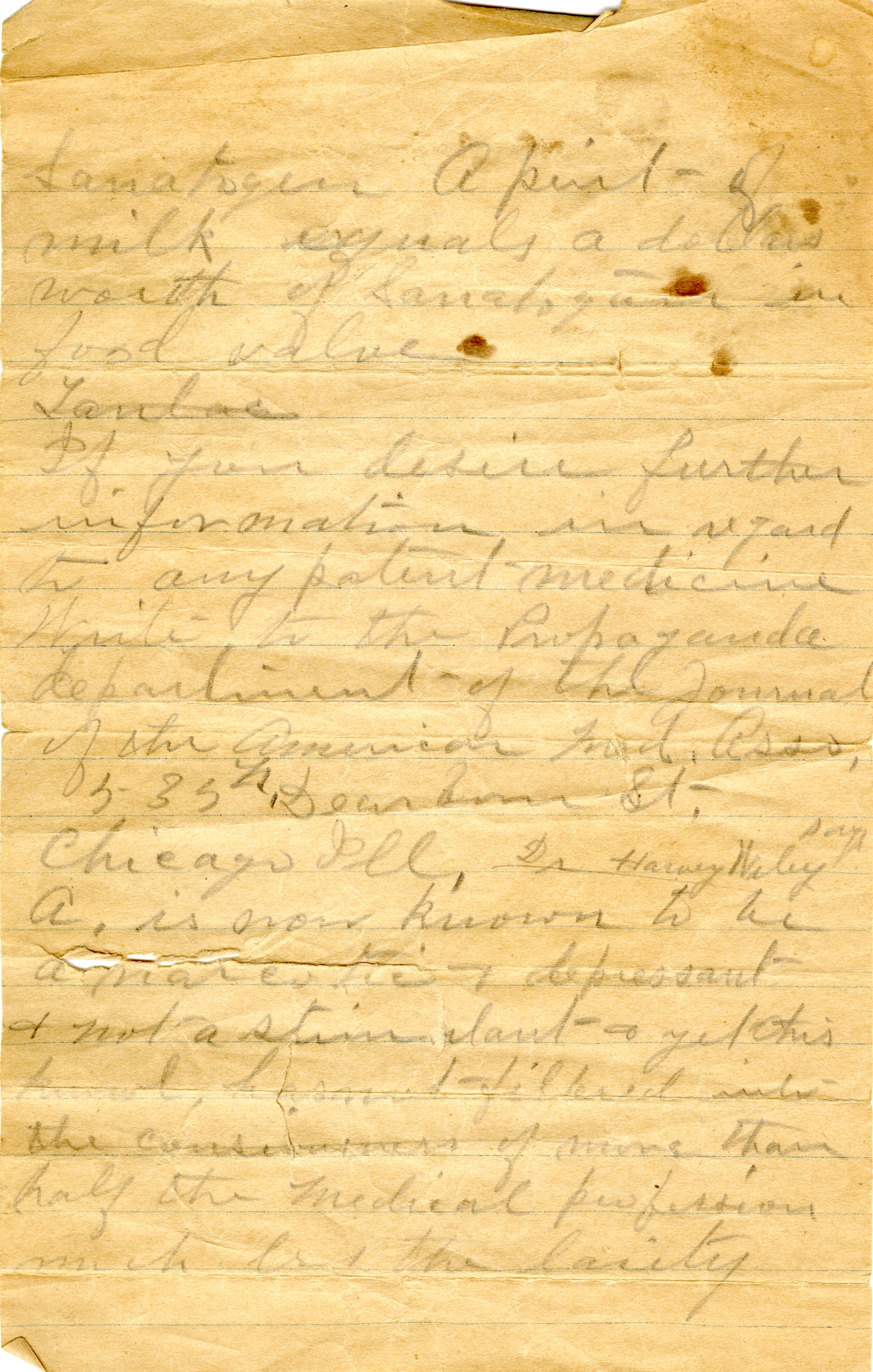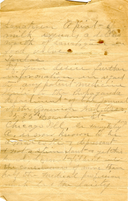 Sanatogen A pint of milk equals a dollars worth of Sanatogen in food value [Lantac] If you desire further information in regard to any patient medicine Write to the Propaganda department of the Journal of the American Med. Asso, 535[?] Dearborn St. Chicago Ill, Dr Harry Wiley [?] A. is now known to be a narcotic + depressant & not a stimulant + yet this knowl. has not filtered into the consciousness of more than half the medical profession much less the laxity