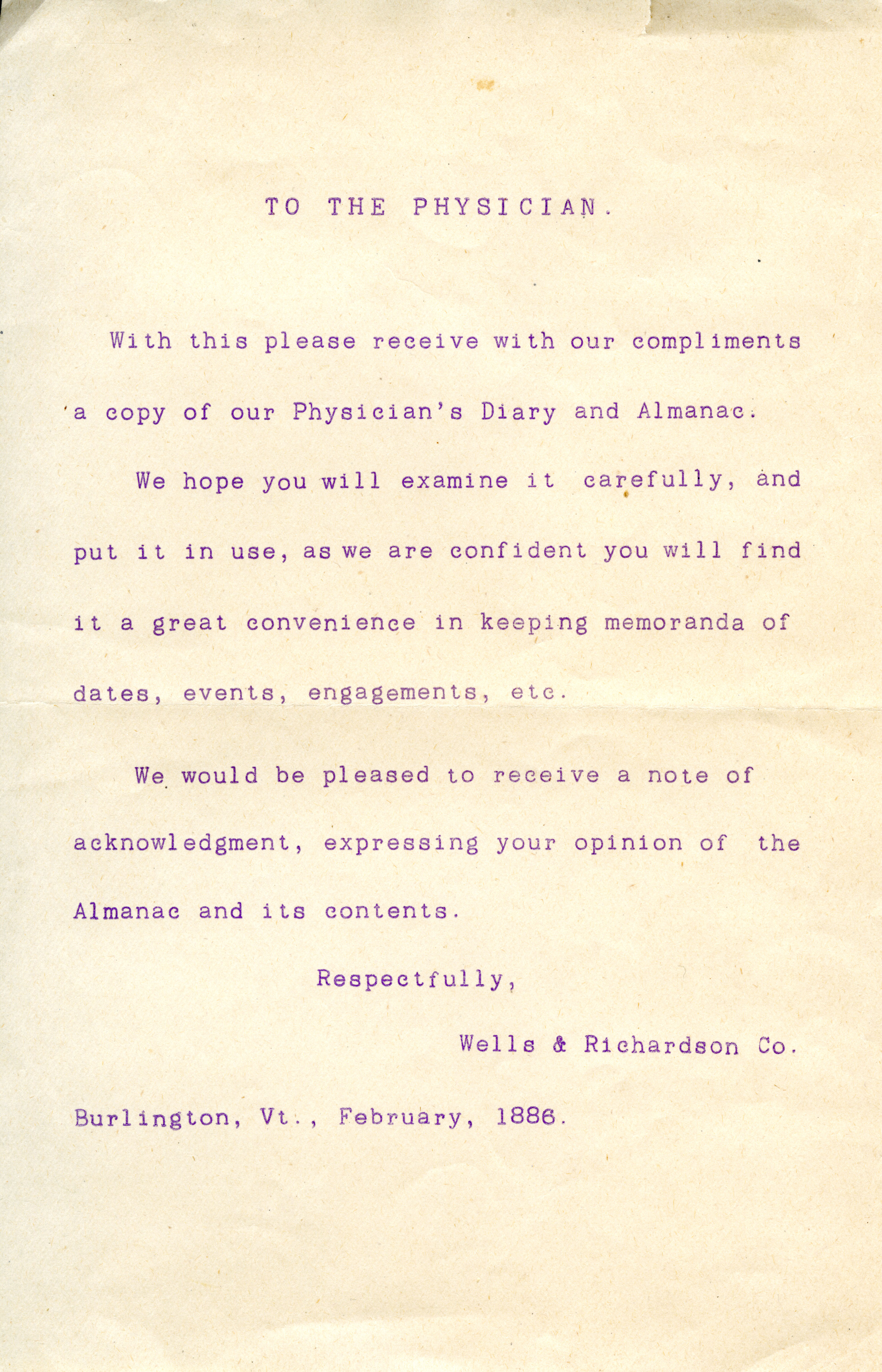 TO THE PHYSICIAN With this please receive with our compliments a copy of our Physician's Diary and Almanac. We hope you will examine it carefully, and put it in use, as we are confident you will find it a great convenience in keeping memoranda of dates, events, engagement, etc. We would be pleased to receive a note of acknowledgment, expressing your opinion of the Almanac and its contents. Respectfully, Wells & Richardson Co. Burlington, Vt., February, 1886.