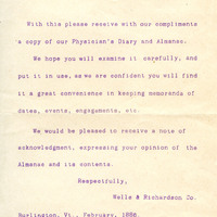 Letter from Wells and Richardson Company sent with their Physician's Diary and Almanac, February 1886