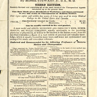 POCKET THERAPEUTICS AND DOSE BOOK.By MORSE STEWART, Jr., B.A., M.D.THIRD EDITIONCarefully Revised and containing all of the most recent of the Therapeutical Agents introduced up to the present time.This Dose Book gives Hundreds of Medicines and Doses not found in any one work on Therapeutics or Materia Medica.Over 6,500 copies sold within two years, it being now used in every Medical College in the United States and Canada.PRICEHandsomely bound in Cloth, $1.00" " Morocco, 1.50Can be readily carried in the vest pocket.A most useful and reliable REFERENCE AND EMERGENCY BOOK, REMEMBRANCER, and POCKET COMPANION, equally serviceable to the practicing physician or pharmacist, as well as to the student in the lecture room; from the fact that it furnishes a digest of a vast variety of practical and valuable knowledge, which is usually learned in many ways, and hence not systematized and arranged for ready and convenient reference.Endorsed and Recommended by the following Professors of Materia Medica and Therapeutics"I have examined the 'Pocket Therapeutics and Dose Book' carefully, and find it replete with valuable and practical information, to which the student can with confidence refer."I shall take pleasure in recommending this little book to my medical class next winter."PROF. J. S. B. ALLEVNE,Of St. Louis Medical College."It is concise, well arranged and convenient little work, one which the student and young practitioner will find of frequent service."I shall recommend it to my students"PROF. E. V. STODDARD,Of Medical Dep't of University of Buffalo."It is very complete and answers the purposes for which it is intended admirably. I will take pleasure in speaking of it to my class, and will recommend it as the best of its kind."PROF. J. A. MCCORKLE,Of Long Island Hospital Medical College."It is full, condensed, portable and very convenient and useful in every way for the purposes intended."I shall recommend it to my classes."PROF F. PEYRE PORCHER,Of Medical College of State of South Carolina."To the student in the lecture room it is an invaluable companion, and to the veteran in practice it affords many refreshing hints."It is entitled to, and I hope will receive a warm welcome from the profession."PROF. T. A. ATCHINSON,Of Medical Dep't Univ. Nashville and Vanderbilt."I have carefully examined the "Pocket Therapeutics and Dose Book," and do not hesitate to say that, in my opinion, it exceeds in merit any book of the kind heretofore published. I hope and believe that 'ere long it will be in possession of every practitioner and student of medicine in the land."PROF. E. L. SHURLY,Of Detroit Medical College."It should be in the hands of every medical man and pharmacist."I will cheerfully recommend it to my classes."PROF. J. W. COMPTON,Of Medical College of Evansville."I have looked it through quite carefully, and am much pleased with it."I regard it as one of the most accurate, convenient and best arranged books of the kind, and hope it will have success it deserves."PROF G. E. FROTHINGHAM,Of Medical Department of Michigan University."It contains a vast amount of information, well classified, and is a wonder of condensations.It meets a very general want, (so far as I am informed, not se well met in any other way.) I shall advise all my students to procure it, and keep it on the office table or carry in the pocket."PROF. HENRY M. FIELD,Of Dartmouth Medical College."If the reader keeps in view, like the author, 'the fact that it is simply to serve as a reminder,' I think it likely to be a useful companion"PROF. ROBERT T. EDES,Of Harvard Medical School"I have carefully examined the 'Pocket Therapeutics and Dose Book," and find it correct, concise, and convenient."PROF. H. V. SWERINGEN,Of Fort Wayne Medical College."I must say that I am well pleased with it; it contains a very condensed form a vast amount of information, highly useful to the Pharmacist as well as the Practitioner of Medicine."PROF. E. S. WAYNE,Of Cincinnati College of Pharmacy."I have carefully examined it, and find it an exceedingly useful companion."PROF J. FARIS MOORE,Of Maryland College of PharmacyAnd many other letters of endorsement from Teachers and active Practitioners, too numerous for publication.Extracts from the Leading Medical Journals of the Country,Thirty-five of which have commended it most highly, as the following short extracts from the same will show: 1. "As a reminder for students approaching their examinations of the most complete of the vest pocket series of books." 2. "We do not remember having seen a more complete pocket reference book than the one before us." 3. "This is one of the fullest little 'Pocket' books we have ever seen." 4. "It fills a gap in medical literature." 5. "This is really the best of its kind that we have ever met." 6. "Surpasses anything we have yet seen of a similar character" 7. "It admirably fills its purpose." 8. "Wonderfully compact." 9. "From cover to cover full of condensed and valuable information, just such information as one requires constantly and often at a moment's notice." 10. "Most useful little book for every physician to carry with him in his pocket to serve in cases of emergency." 11. "A valuable little book for young practitioners." 12. "To the student and young practitioner this work will be of great service." 13. "Every physician will thank us for advising him to buy this little book." 14. "It is a most complete little work on Therapeutics." 15. "Will refresh the memory and prove a friend in need." 16. "For a small book it contains more useful knowledge for the student or young practitioner (or old one either) than any work with which we are acquainted." 17. "Its Posological Table is a feature of special importance." 18. "A great improvement on the average dose book." 19. "A perpetual reminder of ten thousand distinct things, hard for any one to keep in mind and impossible to the student." 20. "We commend it to the favorable consideration of medical men." Etc., etc.,