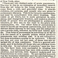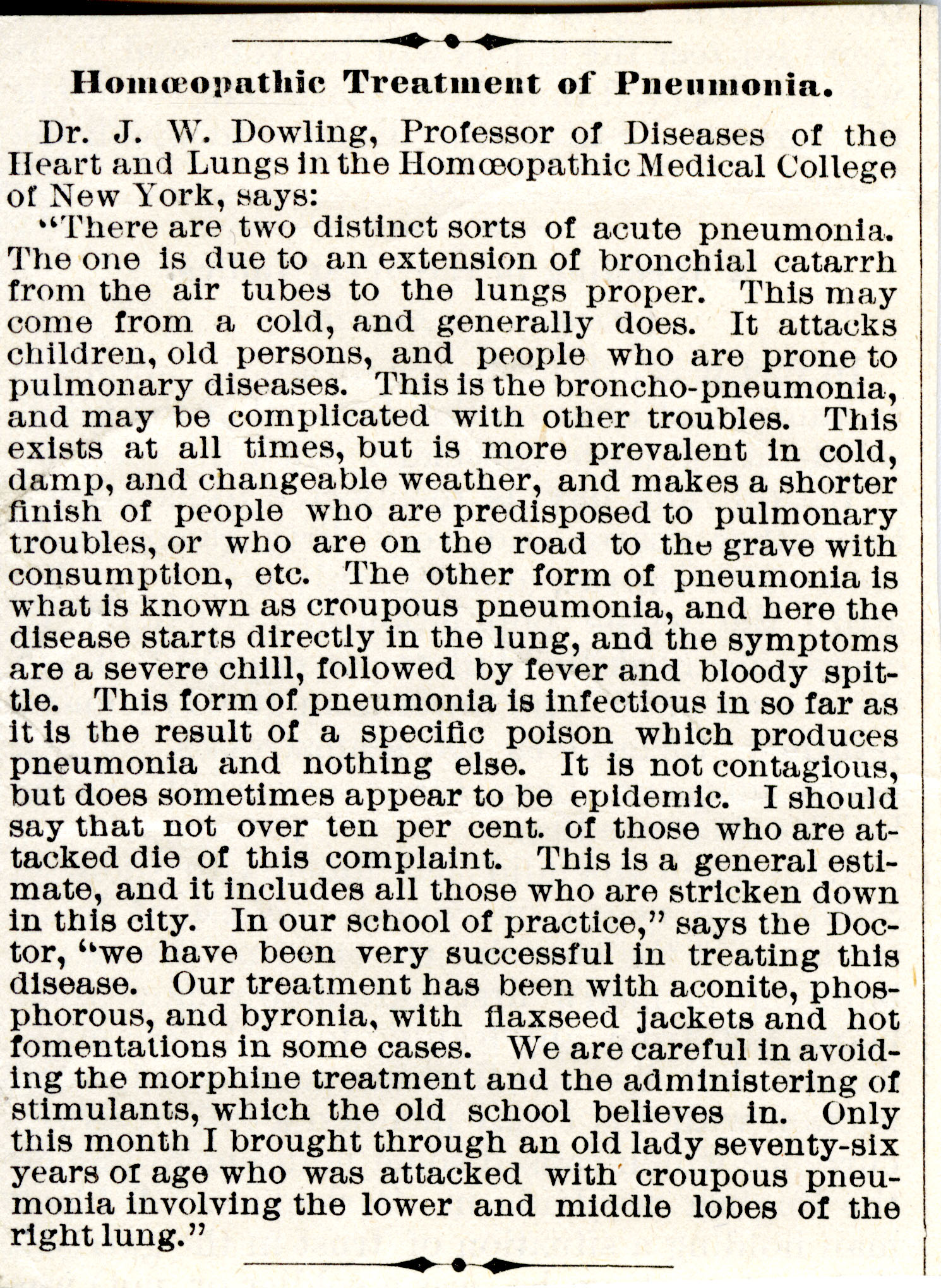 Homoeopathic Treatment of Pneumonia Dr. J. W. Dowling, Professor of Diseases of the Heart and Lungs in the Homoeopathic Medical College of New York, says: "There are two distinct sorts of acute pneumonia. The one is due to extension of bronchial catarrh from the air tubes to the lungs proper. This may come from a cold, and generally does. It attacks children, old persons, and people who are prone to pulmonary diseases. This is the broncho-pneumonia, and may be complicated with other troubles. This exists at all times, but is more prevalent in cold, damp, and changeable weather, and makes a shorter finish of people who are predisposed to pulmonary troubles, or who are on the road to the grave with consumption, etc. The other form of pneumonia is what is known as croupous pneumonia, and here the disease starts directly in the lung, and the symptoms are a severe chill, followed by fever and bloody spittle. This form of pneumonia is infectious in so far as it is the result of a specific poison which produces pneumonia and nothing else. It is not contagious, but does sometimes appear to be epidemic. I should say that not over 10 per cent of those who are attacked die of this complaint. This is a general estimate, and it includes all those who are stricken down in this city. In our school of practice," says the Doctor, "we have been very successful in treating this disease. Our treatment has been aconite, phosphorous, and byronia, with flaxseed jackets and hot fomentations in some cases. We are careful in avoiding the morphine treatment and the administering of stimulants, which the old school believes in. Only this month I brought through an old lady seventy-six years of age who was attacked with croupous pneumonia involving the lower and middle lobes of the right lung."
