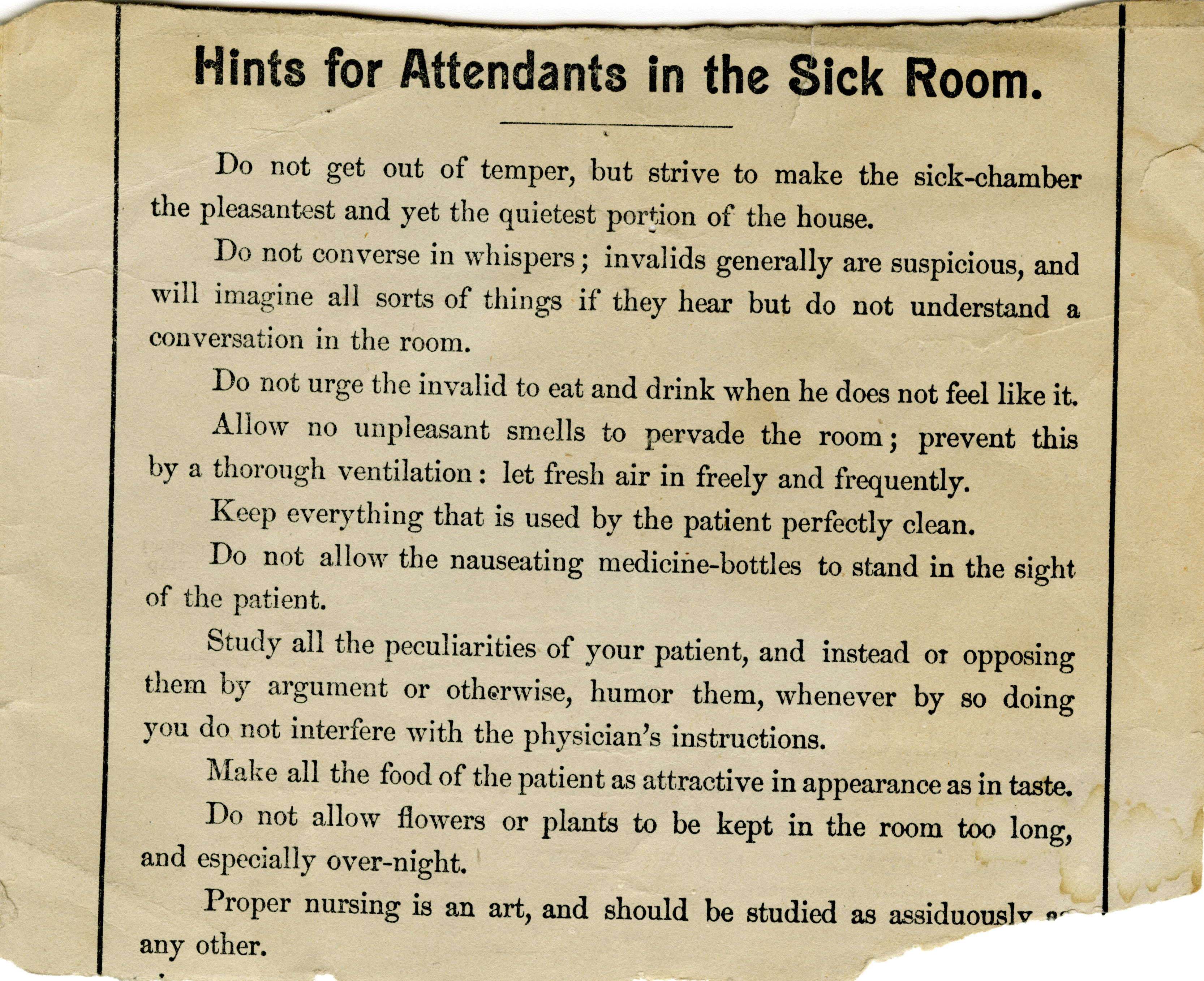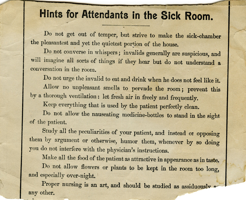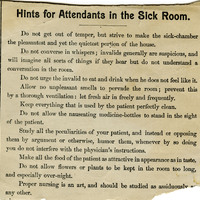 Newspaper clipping titled "Hints for Attendants in the Sick Room," undated.