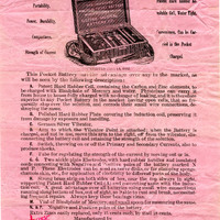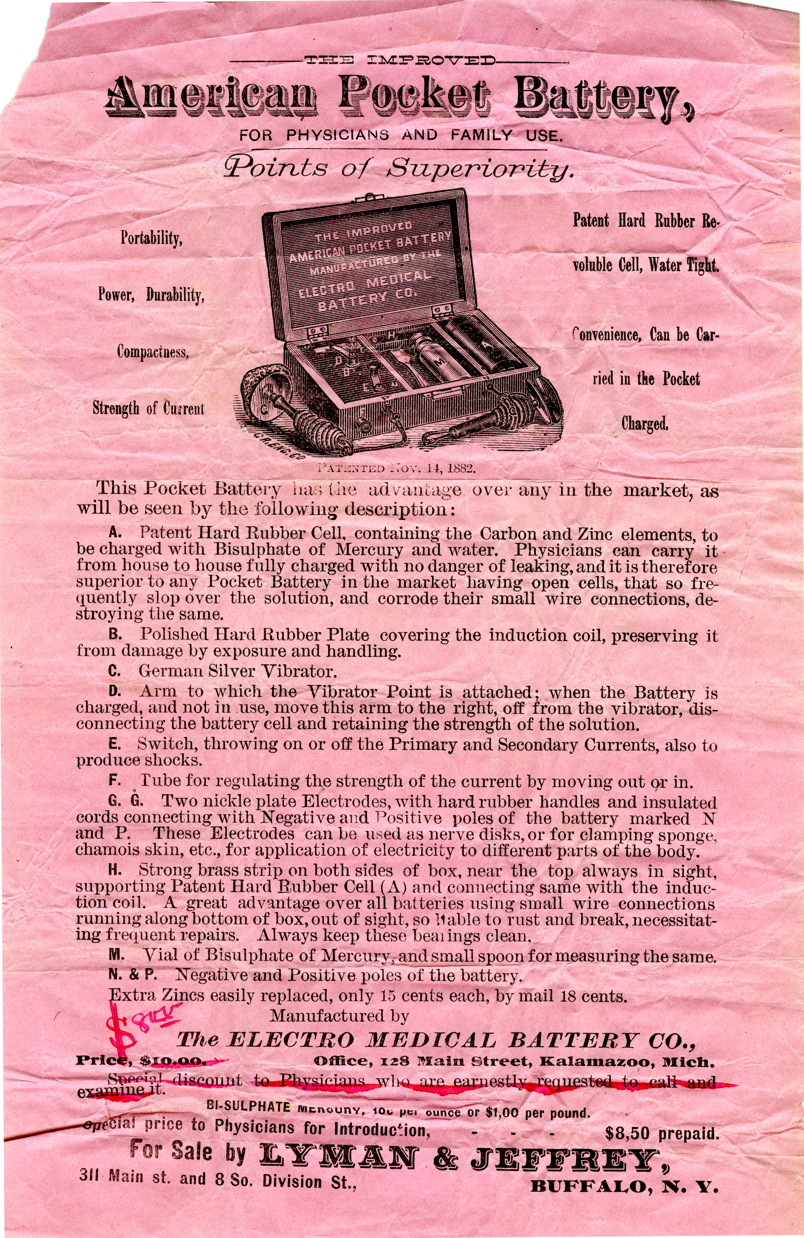 THE IMPROVEDAmerican Pocket BatteryFOR PHYSICIANS AND FAMILY USE.Points of Superiority.Portability,Power, Durability,Compactness,Strength of CurrentPatent Hard Rubber Revoluble Cell, Water Tight.Convenience, Can be Carried in the Pocket Charged.Patented Nov. 14, 1882.This Pocket Battery has the advantage over any in the market, as will be seen by the following description:A. Patent Hard Rubber Cell, containing the Carbon and Zinc elements, to be charged with Bisulphate of Mercury and water. Physicians can carry it from house to house fully charged with no danger of leaking, and it is therefore superior to any Pocket Battery in the market having open cells, that so frequently slop over the solution, and corrode their small wire connections, destroying the same.B. Polished Hard Rubber Plate covering the induction coil, preserving it from damage by exposure and handling.C. German Silver Vibrator.D. Arm to which the Vibrator Point is attached: when the Battery is charged, and not in use, move this arm to the right, off from the vibrator, disconnecting the battery cell and retaining the strength of the solution.E. Switch, throwing on or off the Primary and Secondary Currents, also to Produce shocks.F. Tube for regulating the strength of the current by moving out or in.G. G. Two nickle plate Electrodes, with hard rubber handles and insulated cords connecting with Negative and Positive poles of the battery marked N and P. These Electrodes can be used as nerve disks, or for clamping sponge, chamois skin, etc., for application of electricity to different parts of the body.H. Strong brass strip on both sides of box, near the top always in sight, supporting Patent Hard Rubber Cell (A) and connecting same with the induction coil. A great advantage over all batteries using small wire connections running along bottom of box, out of sight, so liable to rust and break, necessitating frequent repairs. Always keep these bearings clean.M. Vial of Bisulphate of Mercury and small spoon for measuring the same.N. & P. Negative and Positive poles of the battery.Extra Zines easily replaced, only 15 cents each, by mail 18 cents.Manufactured byThe ELECTRO MEDICAL BATTERY CO.,Price, $10 [$8]Office, 128 Main Street, Kalamazoo, Mich.Special discount to Physicians who are earnestly requested to call and examine it.BI-SULPHATE MERCURY, 10 cents per ounce, or $1.00 per pound.Special price to Physicians for Introduction,$8.50 prepaid.For Sale by LYMAN & JEFFREY311 Main St., and 8 So. Division St.,Buffalo, N.Y.