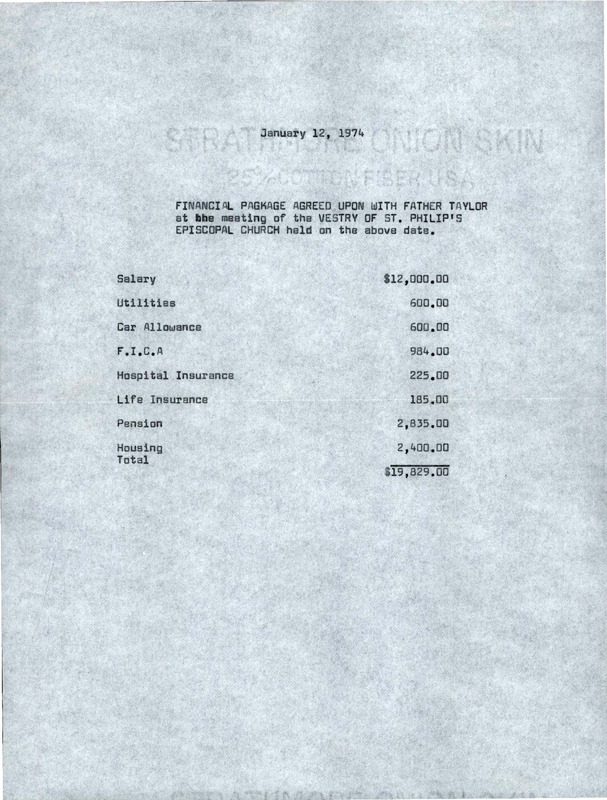 Financial package agreed upon with Father Taylor at the January 12, 1974 meeting of the Vestry of St. Philip's Episcopal Church. Includes salary, ultilities, car allowance, F.I.C.A., hospital insurance, life insurance, pension, and housing.