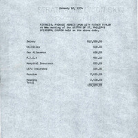 January 12, 1974FINANCIAL PAGKAGE AGREED UPON WITH FATHER TAYLORat the meeting of the VESTRY OF ST . PHILIP'SEPISCOPAL CHURCH held on the above date.Salary $12,000.00Utilities 600.00Car Allowance 600.00F.I.C.A 984.00Hospital Insurance 225.00Life Insurance 185.00Pension 2,835.00Housing 2,400.00Total $19,829.00