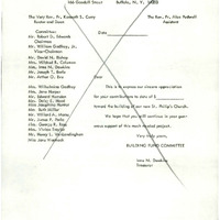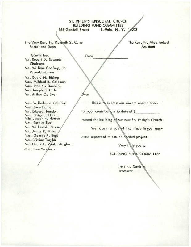 [Page crossed out]ST. PHILIP'S EPISCOPAL CHURCHBUILDING FUND COMMITTEE166 Goodell Street Buffalo, N.Y. 14203The Very Rev. Fr. Ken eth S. CurryRector and DeanThe Rev. Fr. Alec PudwellAssistantCommittee:Mr. Robert D. EdwardsChairmanMr. William Godfrey, Jr.Vice-ChairmanMr. David N. BishopMrs. Mildred B. ColemanMrs. Irma N. DawkinsMr. Joseph T. EarleMr. Arthur O. EveMrs. Wilhelmina GodfreyMrs. Jane HarperMr. Edward HerndonMrs , Daisy E. HoodMiss Josephine HunterMrs. Ruth MillerMr. Willard A. MorseMr. James P. ParksMrs. George R. RoseMrs. Vivian TraylorMr. Henry L. VanLandinghamMiss Jane WarmackDearThis is to express our sincere appreciationfor your contributions to date of $___________toward the building of our new St. Philip's Church.We hope that you will continue in your generoussupport of this much needed project.Very truly yours,BUILDING FUND COMMITTEEIrma N. DawkinsTreasurer[Page 2]3/11/74Hey!Henry wants you to have a copyof this correspondence.More junk for you.LoveLil