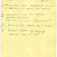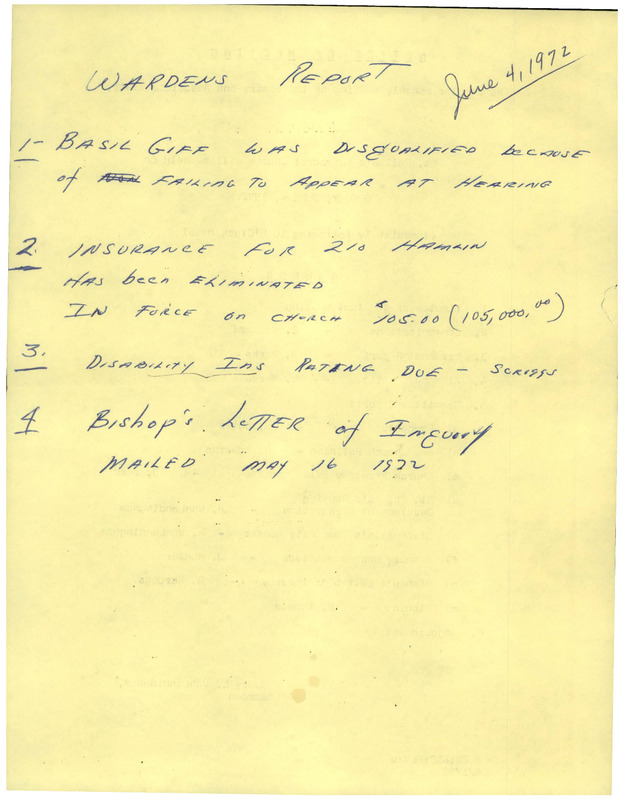 WARDENS REPORTJune 4, 19721 - Basil Giff was disqualified because of failing to appear at hearing2. Insurance for 210 HamlinHas been eliminatedIn force on Church $105.00 (105,000.00)3. Disability Ins Rating Due - Scriggs4 Bishop's Letter of InquiryMailed May 16 1972NOTICE OF MEETINGThe regular monthly meeting of the Vestry and Associate VestryOFSt. Philip's Episcopal Church will be held onSUNDAY, JUNE 4, 1972(Immediately following 10 O'Clock Mass)AGENDA1. Minutes of the last meeting2. Communications - E. Woodward3. Wardens' Report - J. Parks4. Finance Committee - W. Morse5. Committee Reportsa) Property - A. Colesb) New Church Building - R. Edwardsc) Church Property Sale Committee - J. Wardd) St. Philip's HousingDevelopment Corporation - H. VanLandinghame) St. Philip's Community Center - H. VanLandinghamf) Deanery Representatives - J. Hunterg) Bishop's Letter of Inquiry - G. Scruggsh) Picnic - L. Thomas6. AdjournmentHenry L. VanLandingham, WardenSPEC:KSC:HLV:w6/1/72