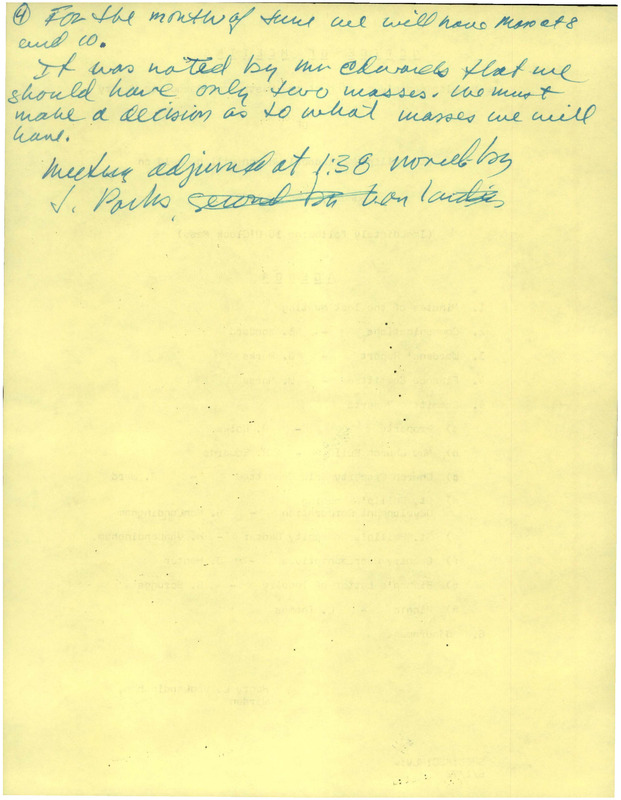 4. For the month of June all will have Mass at 8and 10.It was noted by Mr. Edwards that weshould have only two masses. We mustmake a decision as to what masses we willhave.Meeting adjourned at 1:38 moved byJ. Parks, [[crossed out]] second by Van LandinNOTICE OF MEETINGThe regular monthly meeting of the Vestry and Associate VestryOFSt. Philip's Episcopal Church will be held onSUNDAY, JUNE 4, 1972(Immediately following 10 O'Clock Mass)AGENDA1. Minutes of the last meeting2. Communications - E. Woodward3. Wardens' Report - J. Parks4. Finance Committee - W. Morse5. Committee Reportsa) Property - A. Colesb) New Church Building - R. Edwardsc) Church Property Sale Committee - J. Wardd) St. Philip's HousingDevelopment Corporation - H. VanLandinghame) St. Philip's Community Center - H. VanLandinghamf) Deanery Representatives - J. Hunterg) Bishop's Letter of Inquiry - G. Scruggsh) Picnic - L. Thomas6. AdjournmentHenry L. VanLandingham, WardenSPEC:KSC:HLV:w6/1/72