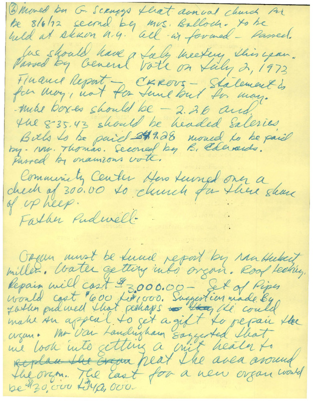 2. Moved by G. Scruggs that annual church picbe 8/6/72 second by Mrs. Bullock. To beheld at Akron N.Y. All is favored - passed.We should have a July meeting this year.Passed by general Vote on July 2, 1973.Finance Report - CK Rovs [?] - Statement isfor May, not for June by for May.[?] boxes should be - 2.26 andthe 835.43 should be headed saleries.Bills to be paid - 249.28 moved to be paidby Mr. Thomas. Seconded by B. Edwards.Passed by unamious vote.Community Center Has turned over acheck of 300.00 to church for there shareof upkeep.Father Pudwell -Organ must be tuned report by Mr. HubertMiller. Water getting into organ. Roof leaking.Repair will cost $3,000.00 - Set of Pipeswould cost $600 to $1000. Suggestion made byFather Putwell that perhaps he couldmake an appeal to get a gift to repair theorgan. Mr. VanLandingham suggested thatwe look into getting a unit heater to[crossed out: replace the organ] heat the area aroundthe organ. The cost for a new organ wouldbe $30,000 to $40,000.NOTICE OF MEETINGThe regular monthly meeting of the Vestry and Associate VestryOFSt. Philip's Episcopal Church will be held onSUNDAY, JUNE 4, 1972(Immediately following 10 O'Clock Mass)AGENDA1. Minutes of the last meeting2. Communications - E. Woodward3. Wardens' Report - J. Parks4. Finance Committee - W. Morse5. Committee Reportsa) Property - A. Colesb) New Church Building - R. Edwardsc) Church Property Sale Committee - J. Wardd) St. Philip's HousingDevelopment Corporation - H. VanLandinghame) St. Philip's Community Center - H. VanLandinghamf) Deanery Representatives - J. Hunterg) Bishop's Letter of Inquiry - G. Scruggsh) Picnic - L. Thomas6. AdjournmentHenry L. VanLandingham, WardenSPEC:KSC:HLV:w6/1/72