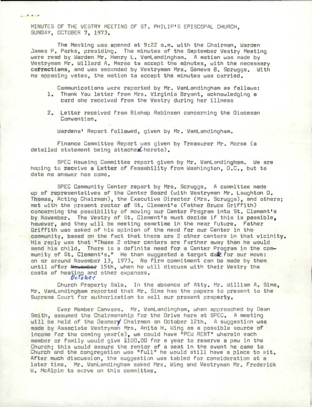 MINUTES OF THE VESTRY MEETING OF ST. PHILIP'S EPISCOPAL CHURCH,SUNDAY, OCTOBER 7, 1973.The Meeting was opened at 9:22 a.m. with the Chairman, WardenJames P. Parks, presiding. The minutes of the September Vestry Meetingwere read by Warden Mr. Henry L. VanLandingham. A motion was made byVestryman Mr. Willard A. Morse to accept the mtnutes, with the necessarycorrections, and was seconded by Vestryman Mrs. Geneva B. Scruggs. Withno opposing votes, the motion to accept the minutes was carried.Communications were reported by Mr. VanLandingham as follows:1. Thank You letter from Mrs. Virginia Bryant, acknowledging acard she received from the Vestry during her illness2. Letter received from Bishop Robinson concerning the DiocesanConvention.Wardens' Report followed, given by Mr. VanLandingham.Finance Committee Report was given by Treasurer Mr. Morse (adetailed statement being attached hereto).SPEC Housing Committee report given by Mr. VanLandingham. We arehoping to receive a Letter of Feasability from Washington, D.C., but todate no answer has come.SPEC Community Center report by Mrs. Scruggs. A committee madeup of representatives of the Center Board (with Vestryman Mr. Laughton D.Thomas, Acting Chairman), the Executive Director (Mrs . Scruggs), and others;met with the present rector of St. Clement 's (Father Bruce Griffith)concerning the possibility of moving our Center Program into St. Clement'sby November. The Vestry of St . Clement's must decide if this is possible,however, and they will be meeting sometime in the near future. FatherGriffith was asked of his opinion of the need for our Center in thecommunity, based on the fact that there are 2 other centers in that vicinity.His reply was that "Those 2 other centers are farther away than he wouldsend his child. There is a definite need for a Center Program in the community of St . Clement 's." He then suggested a target date for our move:on or around [crossed out: November] October 13, 1973. No firm commitment can be made by themuntil after November 15th, when he will discuss with their Vestry thecosts of heating and other expenses.Church Property Sale. In the absence of Atty. Mr. William A. Sims,Mr. VanLandingnam reported that Mr. Sims has the papers to present to theSupreme Court for authorization to sell our present property.Ever Member Canvass. Mr. VanLandingham, when approached by DeanSmith, assumed the Chairmanship for the Drive here at SPEC . A meetingwill be held of the Deanery Chairmen on October 12th. A suggestion wasmade by Associate Vestryman Mrs. Anita H. Wing as a possible source ofincome for the coming year(s), we could have "PEW RENT" wherein eachmember or family would give $100.00 for a year to reserve a pew in theChurch; this would assure the rentor of a seat in the event he came toChurch and the congregation was "full" he would still have a place to sit .After much discussion, the suggestion was tabled for consideration at alater time. Mr. VanLandingham asked Mrs. Wing and Vestryman Mr. FrederickW. McAlpin to serve on this committee.Page 2 of October 7, 1973 Vestry Minutes.Budget Committee. At the suggestion/appointment of the "Chair,"the following will comprise the 1974 Budget Committee:1. Vestryman Scruggs, Chairman2. Associate Vestryman Mr. Sims3. Vestryman Dr. Benjamin F. Bullock, Jr.4. Vestryman (Treasurer) Morse5. Warden James P. ParksNominating Committee. Chairman: Mr. Julius I. Evans; assisted byAssociate Vestrymen: Mrs. Erna S. Clark and Mr. Hubert L. Miller.Mr. VanLandingham informed the Nominating Committee that the followingpersons' terms of office are due to expire:1. Senior Warden: James P. Parks2. Vestryman : William Godfrey, Jr.3. Vestryman Laughton D. Thomas4. Vestryman : Mrs. Geneva B. ScruggsParish Meeting. Mr. Vanlandingham suggested a proposed date forour Annual Parish Meeting: Sunday, December 2, 1973. The congregationwill be properly notified of this meeting.Moving Dates. Mr. VanLandingham reported that the Moving Committeehas had two meetings; the target date for moving is sometime in January.A letter received from Vestryman Mr. Robert D. Edwards and attached to theseminutes was read. Mr. Edwards, in his letter, states that he has been workingwith very knowledgeable persons on how to get our organ into St. Clement's.Father Edward Kryder, of Calvary Church-Williamsville, has offered hisservices in this area so that we may utilize (as best as we can) our effortsin getting all/most of our i tems into St. Clement's. A motion was made byMrs . Scruggs that we accept Father Kryder as "Consultant in our Moving."It was seconded by Mr. Morse. With no opposition, the motion was unanimouslycarried. It was further moved by Mrs. Scruggs, and seconded by Mr. Morse,that the letter received from Mr. Edwards (mentioned above) be attached tothe minutes of this meeting, for future reference.Church Property Sale. Atty Mr. Sims, now having arrived, made thefollowing report. The papers have been completed (for Church's Sale), andare ready to be filed. The Church Survey has been sent to the City ofBuffalo. Mr. Sims asked for guidance from the Vestry as to whether heshould "close early" and make arrangements for paying rent, or wait unt i llater this year. St. Clement's lawyer has contacted Mr. Sims, and he(Mr. Sims) will know in 2 weeks, or sometime thereafter, whether or not wecan proceed into St. Clement's. He feels that St. Clement's has finalizedher plans for merging (with St. James), and we can possibly move intoSt. Clement's in 3-4 weeks. The following comments/discussion followed:Mrs. Clark asked Mr. Sims that if everything is ready for the s ale of SPEC,perhaps we could hold off until St. Clement 's completes its plans so thatwe won 't have to pay rent at our present location. Mr. Morse suggestedthat we set a tentative Sale Date for the first week in December.Mr. Vanlandingham reminded us that for the record, we ne ed to have Atty.Mr. Sims' name applied as "Attorney for the Purchase of St. Clement's."It was moved by 