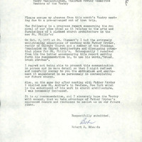 Buffalo, New YorkOctober 6, 1973To: James Parks, Senior WardenHenry VanLandingham, Chairman Moving CommitteeMembers of the VestryPlease excuse my absence from this month's Vestry meetingdue to a pre-arranged out of town trip.The following is a progress repor t concerning the removalof our pipe organ as it relates to the arts andfurnishings of a planned church architecture in thenew St. Philip's;On Oct. 2, 1973 at St. Clement's I had the extremelyenlightening experience of meeting with Father Kryder,rector of Calvary Church and a member of the DiocesanCommission on Church Architecture and discussing potentialplans for St. Philip's. Subsequently I receivedfrom him the letter accompanying this report settingforth his recommendation in, to use his words,"broad,brush strokes".I regret not being able to present this communicationin person and in more detail so that I might reflectand hopefully convey to you the enthusiasm and excitementit engendered in me personnaly in contemplatingour future church.Also, on the same day after meeting with Father KryderI visited new St. Andrew's in Newfane, New York whichis the embodiment of his work in church architecture .I was immensely impressed.It is my recommendation, and I sincerely hope the Vestrywill concur, that we take advantage of Father Kryder'sexpressed desire and readiness to assist us in our futureplans.Respectfully submitted,BobRobert D. Edwards