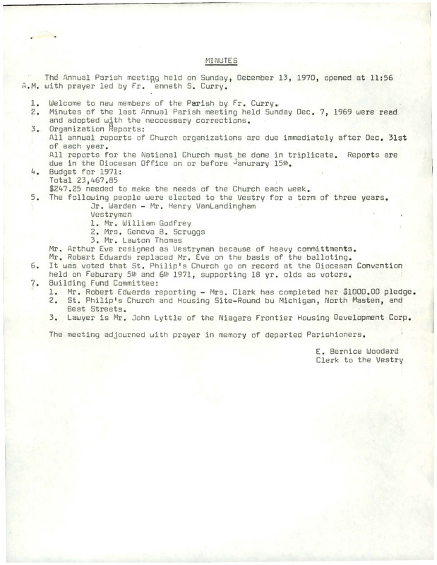 MINUTESThe Annual Parish meeting held on Sunday, Detember 13, 1970, opened at 11:56A.M. with prayer led by Fr. enneth S. Curry.1. Welcome to new members of the Parish by Fr. Curry.2. Minutes of the last Annual Parish meeting held Sunday Dec. 7, 1969 were readand adopted with the neccesssry corrections.3. Organization Reports:All annual reports of Church organizations are due immediately after Dec. 31stof each year.All reports for the National Church must be done in triplicate. Reports aredue in the Diocesan Office on or before Janurary 15th.4. Budget for 1971:Total 23,467.85$247.25 needed to make the needs of the Church each week.5. The following people were elected to the Vestry for a term of three years.Jr. Warden - Mr. Henry VanlandinghamVestrymen1. Mr. William Godfrey2. Mrs. Geneva B. Scruggs3. Mr. Lawton ThomasMr. Arthur Eve resigned as Vestryman because of heavy committments.Mr. Robert Edwards replaced Mr. Eve on the basis of the balloting.6. It was voted that St. Philip's Church go on record at the Diocesan Conventionheld on Feburary 5th and 6th 1971, supporting 18 yr. olds as voters.7. Building Fund Committee:1. Mr. Robert Edwards reporting - Mrs. Clark has completed her $1000.00 pledge.2. St. Philip's Church and Housing Site-Round by Michigan, North Masten, andBest Streets.3. Lawyer is Mr. John Lyttle of the Niagara Frontier Housing Development Corp.The meeting adjourned with prayer in memory of departed Parishioners.E. Bernice WoodardClerk to the VestryThose Present at the Annual ParishMeeting-Sunday, December 13, 19701. Fr. Kenneth Curry2. Fr. Alec Pudwell3 . Mrs. Emma Cl e rk4. Mr. Henry Vanlandingham5. Mrs. Edythe Woodard6. Mrs. Vivian Traylor7. Mrs. Maryella Witherspoon8. Mrs. Anita Wing9. Mr. James Parks10. Mrs. Geneva Scruggs11. Mrs. Daisy Mullins12 . Mrs. Lorraine Edwards13. Mrs. Viola Elliot14. Mrs. Sadie Gross15. Mrs. Jeanette Strothers16. Mr. Addison Hinton17. Mr. Stephen Malcolm Sr.18. Mr. John Smith Sr.19. Miss Linda Dawkins20. Mr. Ernest Broadway21 - Mr. J.L. Traylor Sr.22. Mrs. Elsie Sparks23. Mr. Daniel Sparks24. Mr. William Godfrey25 . Mrs. Wilhelmina Godfrey26. Mrs. Emma Bullock27. Mr. Arthur O. Eve28. Mrs. Mildred Coleman29. Mrs. Mabel Maloney30. Mrs. Jessie Blackman31. Mr. Robert Edwards32. Miss Arthen Mills33. Mr. Clarence Howard34. Mrs. Hazel Vanlandingham35. Miss Dalea Wilson36. Mrs. Lillian Parks37. Mr. Eric Lomax38. Miss Jane Warmack39. Mr. Alphonso Davis III40. Dr. Benjamin Bullock Jr.41. Mrs. Henrietta Campbell42. Mr. E.V. Leslie43. Mr. Juluis L. Evans44. Mr. William Blassingame45. Miss Dorothy J. Norris46. Mr. Kenneth Greene47. Mrs. Arnella Lomax48. Mrs. Marjorie Rudd49. Mrs. Lena Lee50. Miss Josephine Hunter51. Mrs. Ruth Miller52. Mrs. Margaret Diggs53. Mrs. Dorothy Johnson54. Mr. Michael Curry55. Mrs. Margaret Austin56. Mrs. Irene Greene57. Mrs. Rebecca Lane58. Mrs. Viola Leslie59. Miss Margaret Campbell60. Mr. Philip Goffney61. Mr. Laughton Thomas62. Miss Sharon Curry63. Miss Sheila Price64. Miss Debra Johnson65. Miss Patricia Mack66. Miss Dorothy Broadway67. Miss Pamela Lee68. Mr. Michael Hughes69. Mr. Earl Pierce70. Miss Donzell Rudd71. Mrs. June Earlespecksc ec/sap