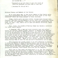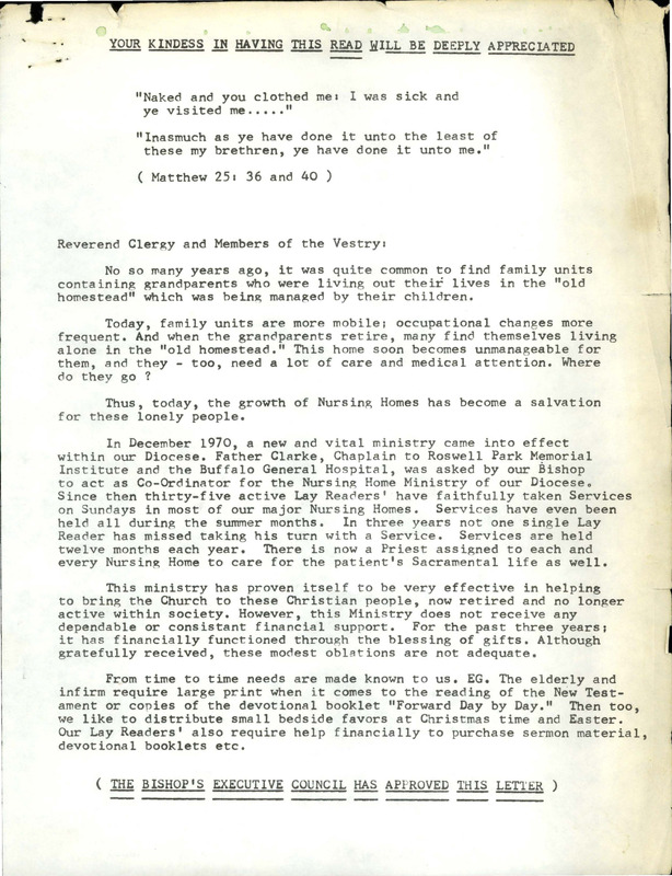 YOUR KINDESS IN HAVING THIS READ WILL BE DEEPLY APPRECIATED"Naked and you clothed me: I was sick andye visited me.....""Inasmuch as ye have done it unto the least ofthese my brethren, ye have done it unto me."(Matthew 25: 36 and 40)Reverend Clergy and Members of the Vestry:No so many years ago, it was quite common to find family unitscontaining grandparents who were living out their lives in the "oldhomestead" which was being managed by their children.Today, family units are more mobile; occupational changes morefrequent. And when the grandparents retire, many find themselves livingalone in the "old homestead." This home soon becomes unmanageable forthem, and they - too, need a lot of care and medical attention. Wheredo they go?Thus, today, the growth of Nursing Homes has become a salvationfor these lonely people.In December 1970, a new and vital ministry came into effectwithin our Diocese. Father Clarke, Chaplain to Roswell Park MemorialInstitute and the Buffalo General Hospital, was asked by our Bishopto act as Co-ordinator for the Nursing Home Ministry of our Diocese.Since then thirty-five active Lay Readers' have faithfully taken Serviceson Sundays in most of our major Nursing Homes. Services have even beenheld all during the summer months. In three years not one single LayReader has missed taking his turn with a Service. Services are heldtwelve months each year. There is now a Priest assigned to each andevery Nursing Home to care for the patient's Sacramental life as well.This ministry has proven itself to be very effective in helpingto bring the Church to these Christian people, now retired and no longeractive within society. However, this Ministry does not receive anydependable or consistent financial support. For the past three years;it has financially functioned through the blessing of gifts. Althoughgratefully received, these modest oblations are not adequate.From time to time needs are made known to us. EG. The elderly andinfirm require large print when it comes to the reading of the New Testamentor copies of the devotional booklet "Forward Day by Day." Then too,we like to distribute small bedside favors at Christmas time and Easter.Our Lay Readers' also require help financially to purchase sermon material,devotional booklets etc.(THE BISHOP'S EXECUTIVE COUNCIL HAS APPROVED THIS LETTER)Last year we realized the need for a "PrayerBook Service" in large bold print. This was going to prove a costlyventure. The total amount required was one thousand, four hundred andseventeen dollars and eighty cents. We stepped forward in faith believingthe Holy Spirit would help us in time. There were many many hours spentplanning and preparing for the production of this book. A total of fourteenmeetings were held and on an average of four hours per meeting atthe Diocesan House. Finally we placed our order for the number of bookswe required for diocesan use. They arrived and so did the bill ! However,in one day we raised almost the entire amount - save two hundred dollars.The book was paid for by the Lay Readers' involved in the Nursing HomeMinistry themselves. It was a worthy project but now we need your helpas members of the Vestry.On Saturday evening, February 2nd., 1974 - weplan to sponsor a Dinner and Dance open to the entire Diocesan Family andtheir friends. It will be held at the "Pellamwood House" 3300 Transit Road., -at Clinton, West Seneca, N.Y. All proceeds from this project will be givento the Nursing Home Ministry within our own Diocese in order to bettersupport the elderly and infirm.We are asking each Parish to act as a "Patron."Will you please help us ? We have at the present no funds of our own.We shall gladly print your Parish's name on the Dinner Menu if you willrespond by acting as a Patron.We invite all members of each Vestry and theirspouses; also their friends. As a Committee, may we suggest respectfullythat you treat your Clergyman and his wife to this event ? It would beso nice to see and have with us the Clergy of our Diocese. We do sincerelythank you for your kindness in reading this long but important letter.Please send your check to the address listed below in the lower left handcorner. Thank you once again. We remain.Very sincerely yours,THE DINNER-DANCE COMMITTEENURSING HOME MINISTRY - LAY READERS.PLEASE SEND YOUR CHECK TO: Mr. Albert L. Knobloch,1114 Delaware Avenue,Buffalo, New York, 14209.PLEASE MAKE CHECK OUT TO: " DINNER DANCE-NURSING HOME MINISTRY. "DINNER DANCE TICKET $8.00 PER PERSON.WE RESPECTFULLY SUGGEST EACH MISSION OR CHURCH USE THEIR OWN DISCRETIONWITH REGARD TO HOW MUCH THEY WILL GIVE TOWARD THIS PROJECT. THANK YOU.