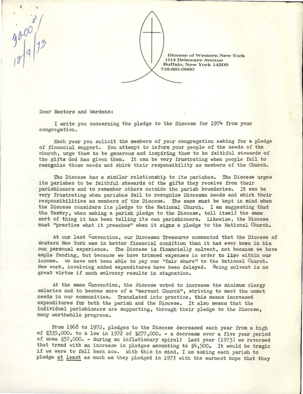Typewritten letter from Bishop of Western New York Harold Barrett Robinson to Diocese of Western New York rectors and wardens concerning the 1974 pledge to the Diocese, December 9, 1973.