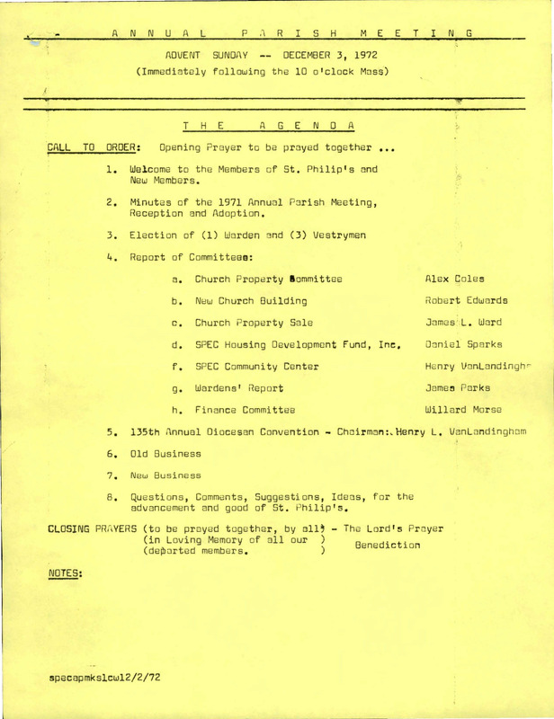 Typewritten agenda and minutes for the Annual Parish Meeting of St. Philip's Episcopal Church on Advent Sunday, December 3, 1972.