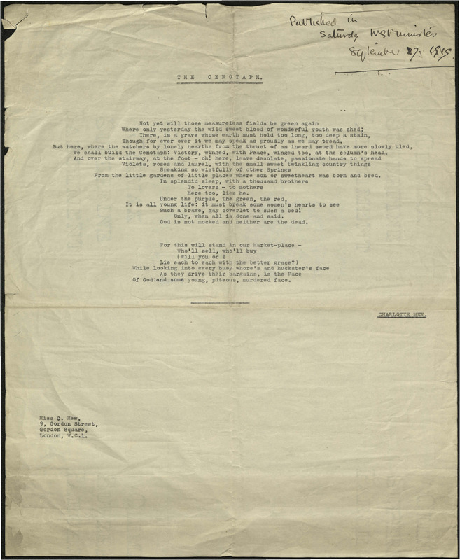 Charlotte Mew's typed manuscript for poem "The Cenotaph" with Mew's note in ink, "Published in Saturday Westminster September 28, 1919," circa 1919.