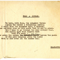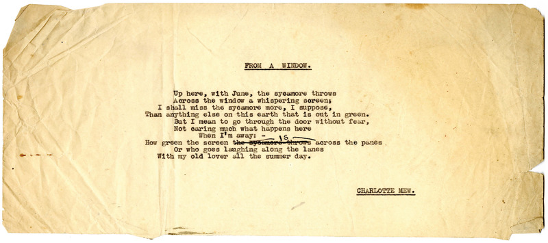 - Charlotte Mew's undated typed manuscript of poem "From a Window" corrected by Mew in ink.