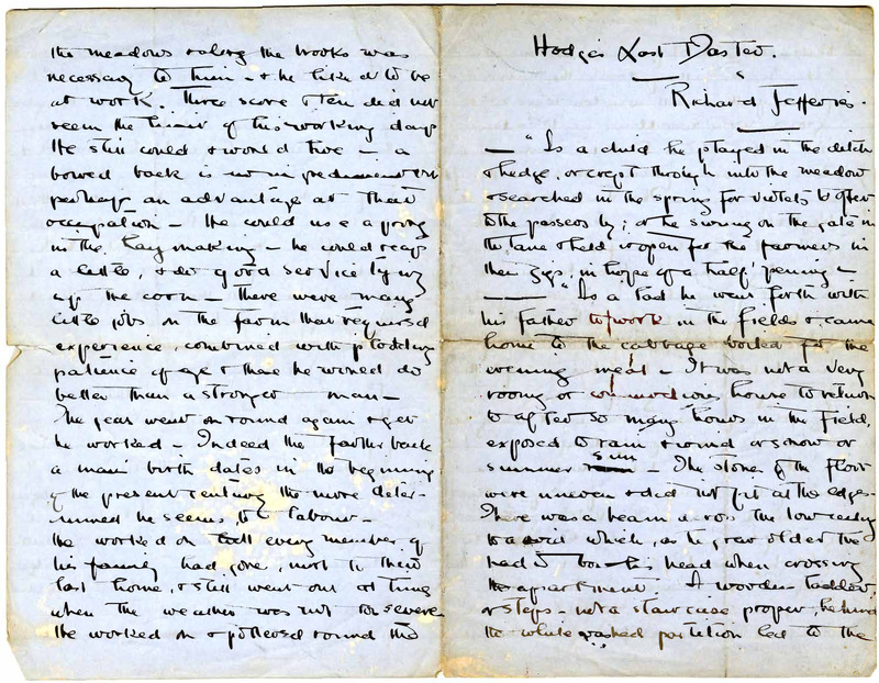 - Copy of "Hodge's Last Masters" from "Hodge and His Masters" by Richard Jeffries written in Charlotte Mew's hand.