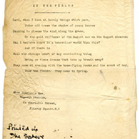 - Charlotte Mew's typed manuscript for poem "In The Fields." Mew's note in ink records the poem's 1923 publication in British newspaper The Sphere.