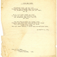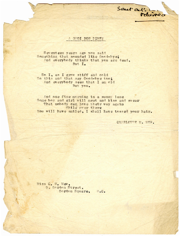 - Charlotte Mew's undated typed manuscript for poem "A Quoi Bon Dire?" Mew's note in ink records that the poem was rejected when submitted for publication.