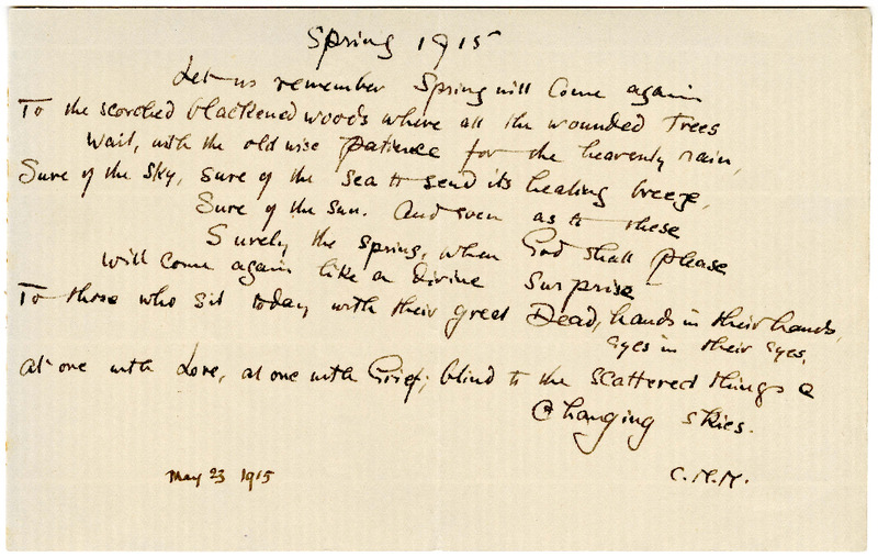 - Charlotte Mew's autograph manuscript of poem published as "May 1915" but here titled "Spring 1915." Signed "C.M.M." and dated May 23, 1915.