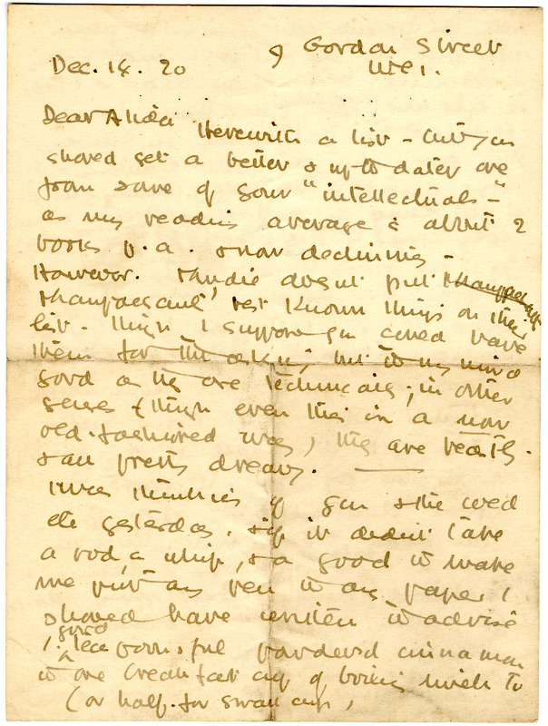 Autograph letter signed from Charlotte Mew to Alida Klementaski Monro, December 14, 1920