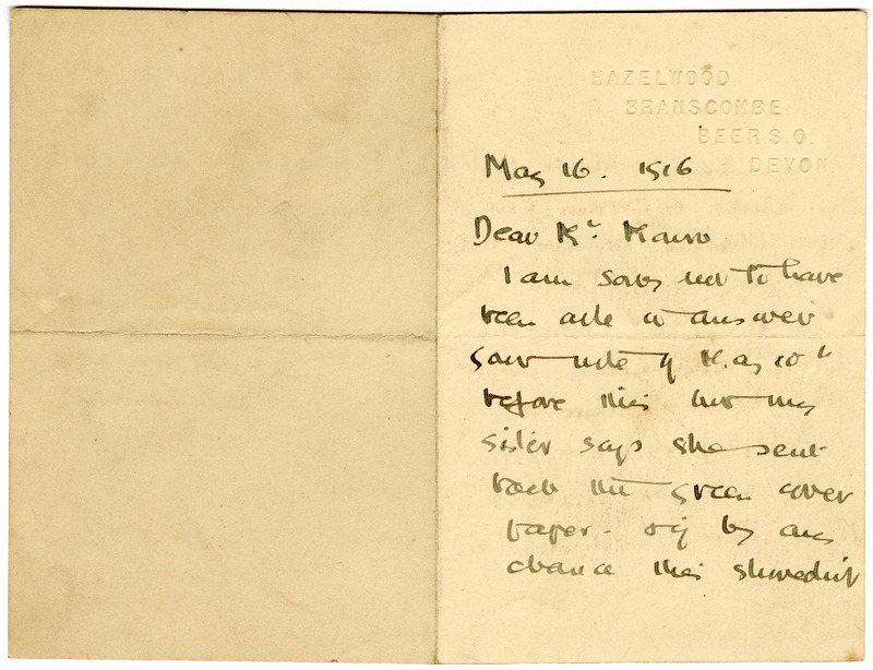 Autograph letter signed from Charlotte Mew to Harold Monro, May 16, 1916