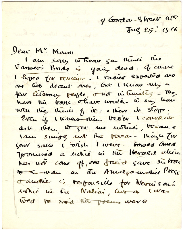Autograph letter signed from Charlotte Mew to Harold Monro, July 29, 1916