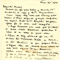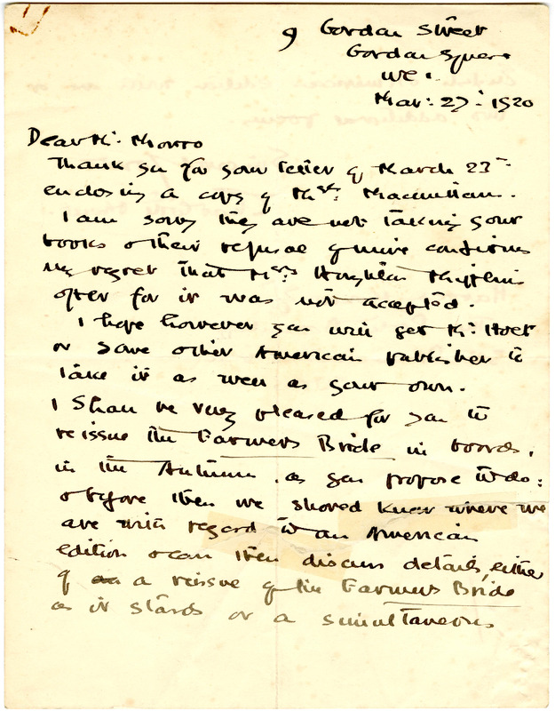Autograph letter signed from Charlotte Mew to Harold Monro, March 27, 1920
