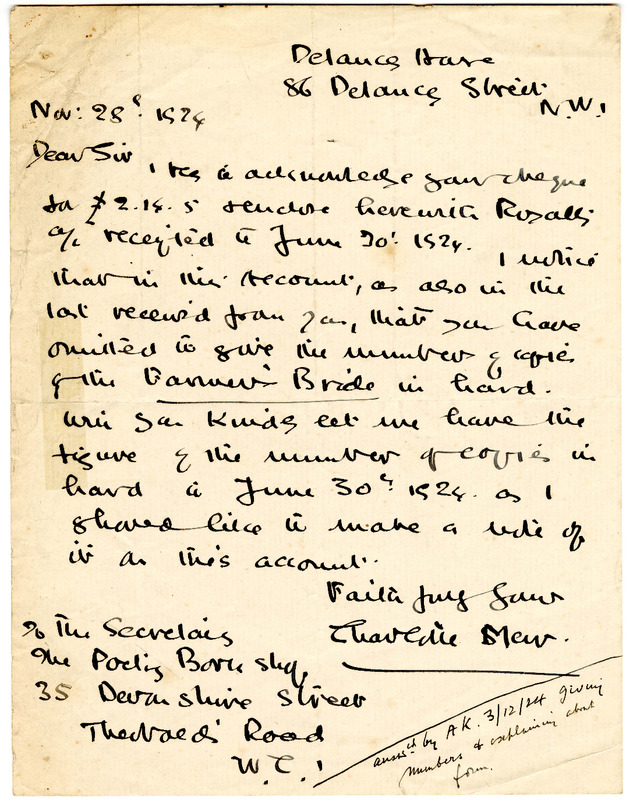 Autograph letter signed from Charlotte Mew to Harold Monro, November 28, 1924