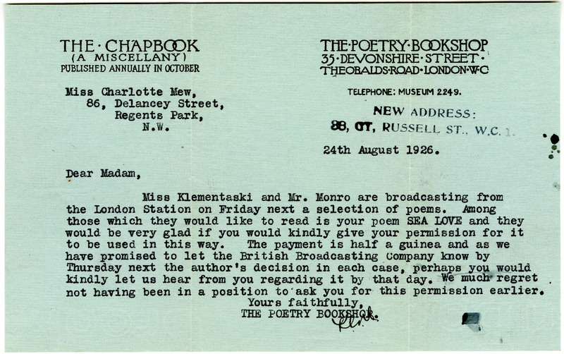 Typed letter from the Poetry Bookshop to Charlotte Mew, August 24, 1926