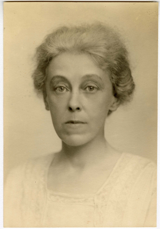 - Undated black-and-white photograph of Charlotte Mew. Mew wears her light-colored hair short and wears a white dress.