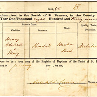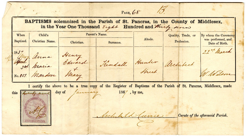 - Baptism certificate for Anna Kendall (Charlotte Mew's mother), January 22, 1867