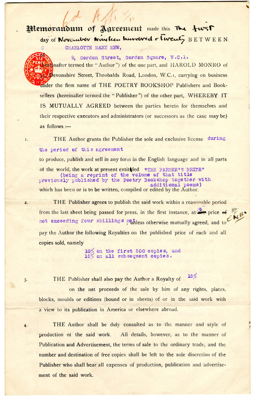 - This contract between Charlotte Mew and Harold Monro outlines terms for the expanded 1921 edition of "The Farmer's Bride," originally published in 1916. Page three (verso of page 2) has been rotated for readability.