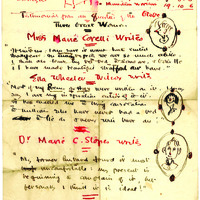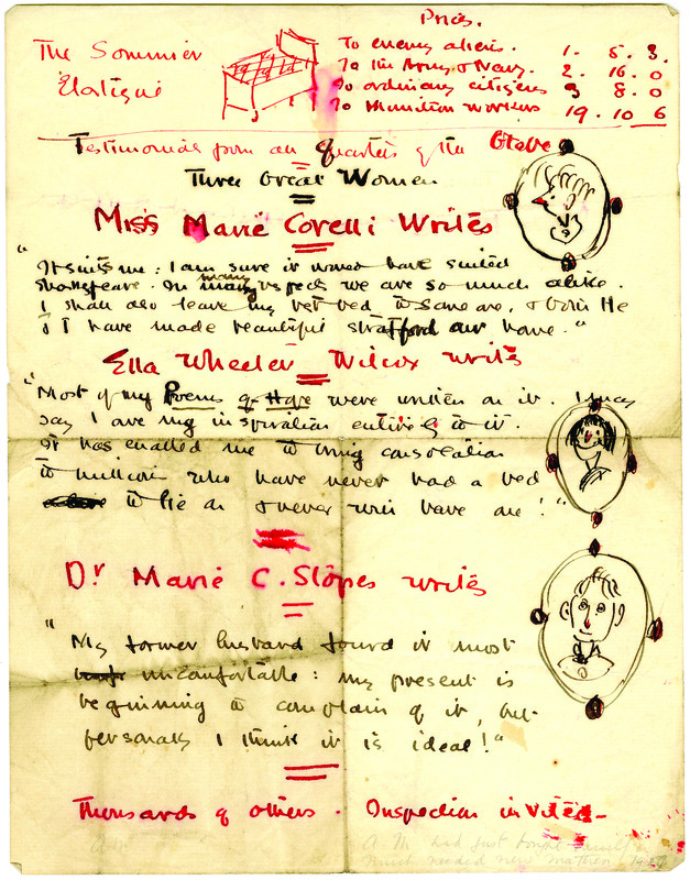 Autograph letter signed from Charlotte Mew to Alida Klementaski Monro dated 1917. Charlotte Mew sketches a mattress and portraits of three imaginary individuals giving testimonials about the mattress. Recto of page 2 has been rotated for readability. On this page, Mew sketches a dog in a chair, a bird, and bags of seed. Text added later in pencil reads: "C.M.'s parrot thanks A.M.'s dog for [illegible]."