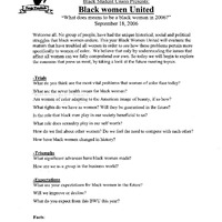 Typed handout with information about the prompt "What does means to be a black woman in 2006?" for the Black Student Union's Black women United event on September 18, 2006.