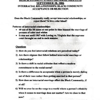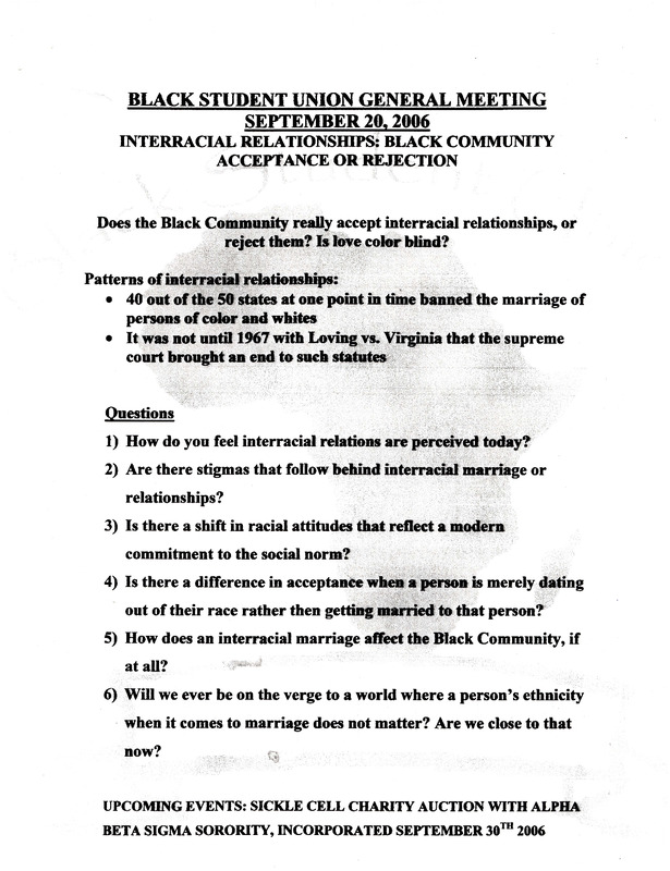 Typed handout with information and discussion questions on the topic "Interracial Relationships: Black Community Acceptance or Rejection" for the Black Student Union's general meeting on September 20, 2006.