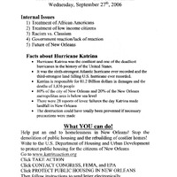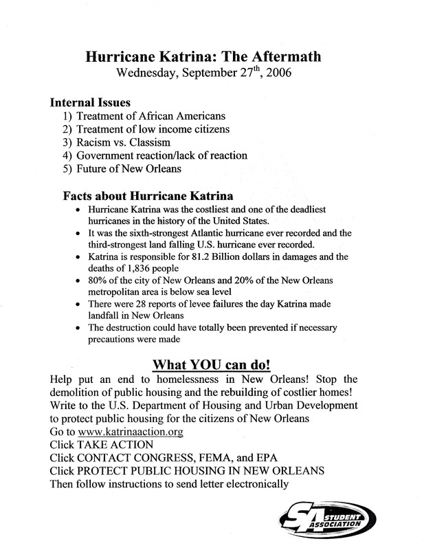 Typed handout with information about Hurricane Katrina, dated September 27, 2006. Handout has the Student Association logo on it. Includes handwritten note: "Skating Jam 10/27/06."