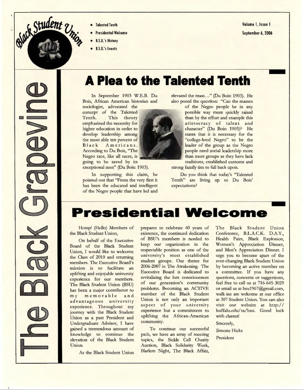 Volume 1, Issue 1 of the Black Student Union's newsletter, "The Black Grapevine," published on September 6, 2006.