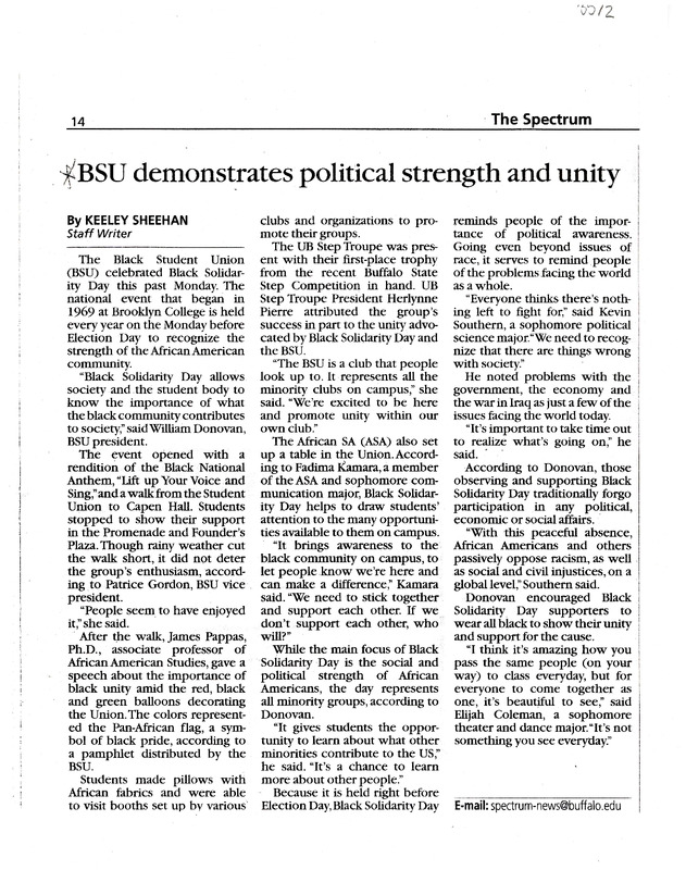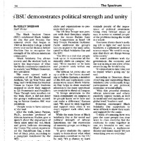 - Photocopied newspaper clipping of The Spectrum article "BSU demonstrates political strength and unity" by Keeley Sheehan, undated.